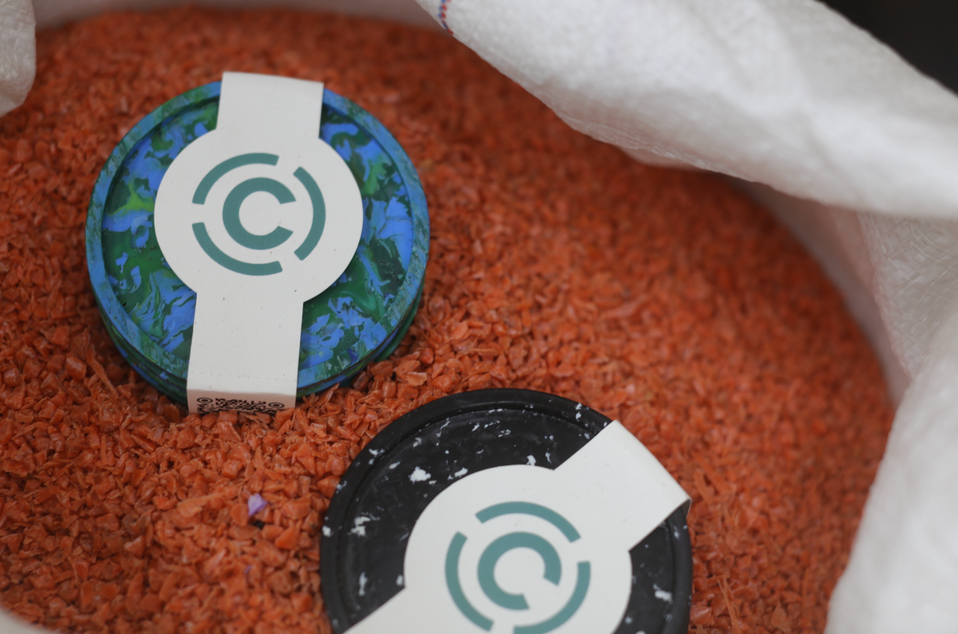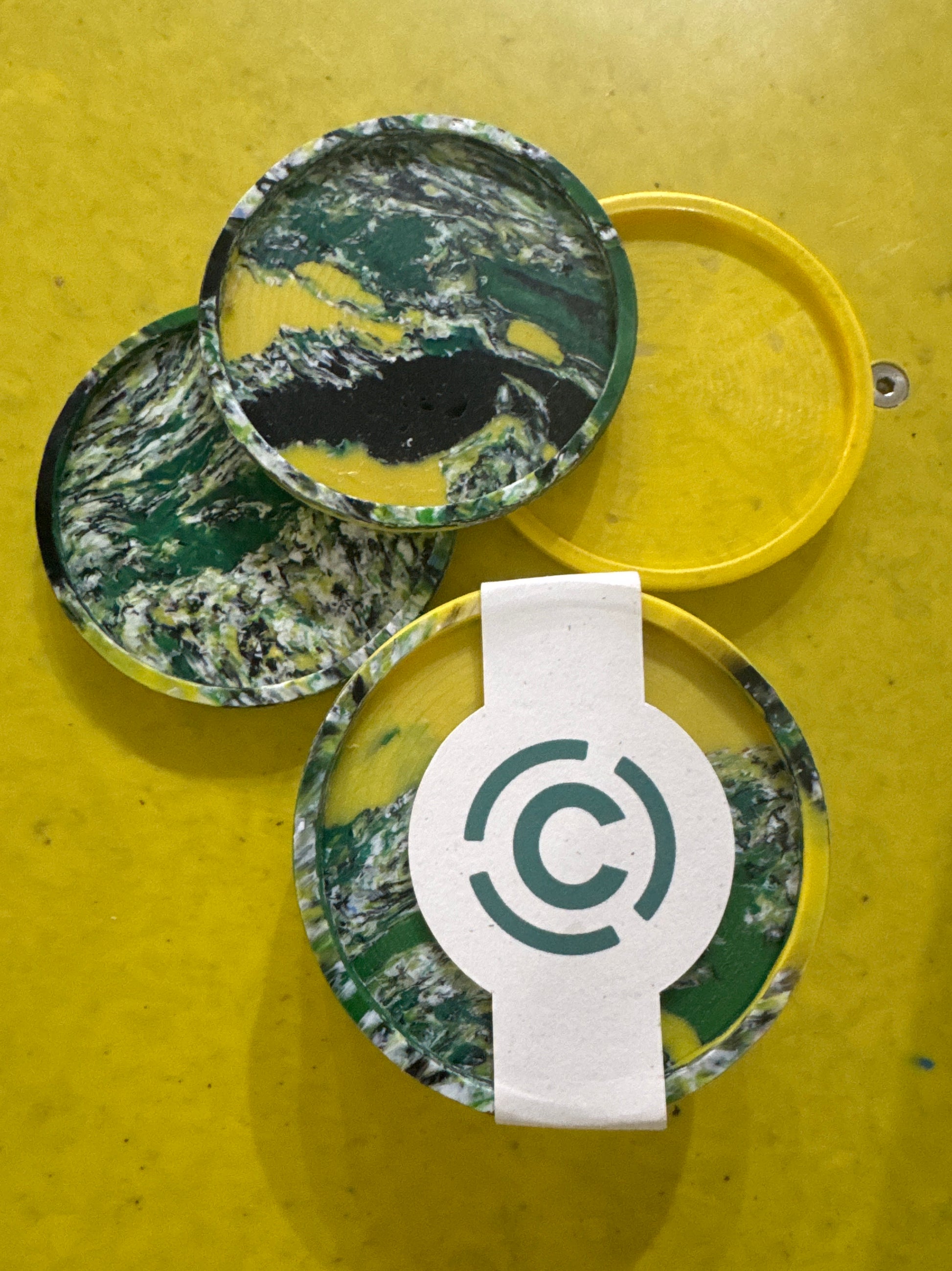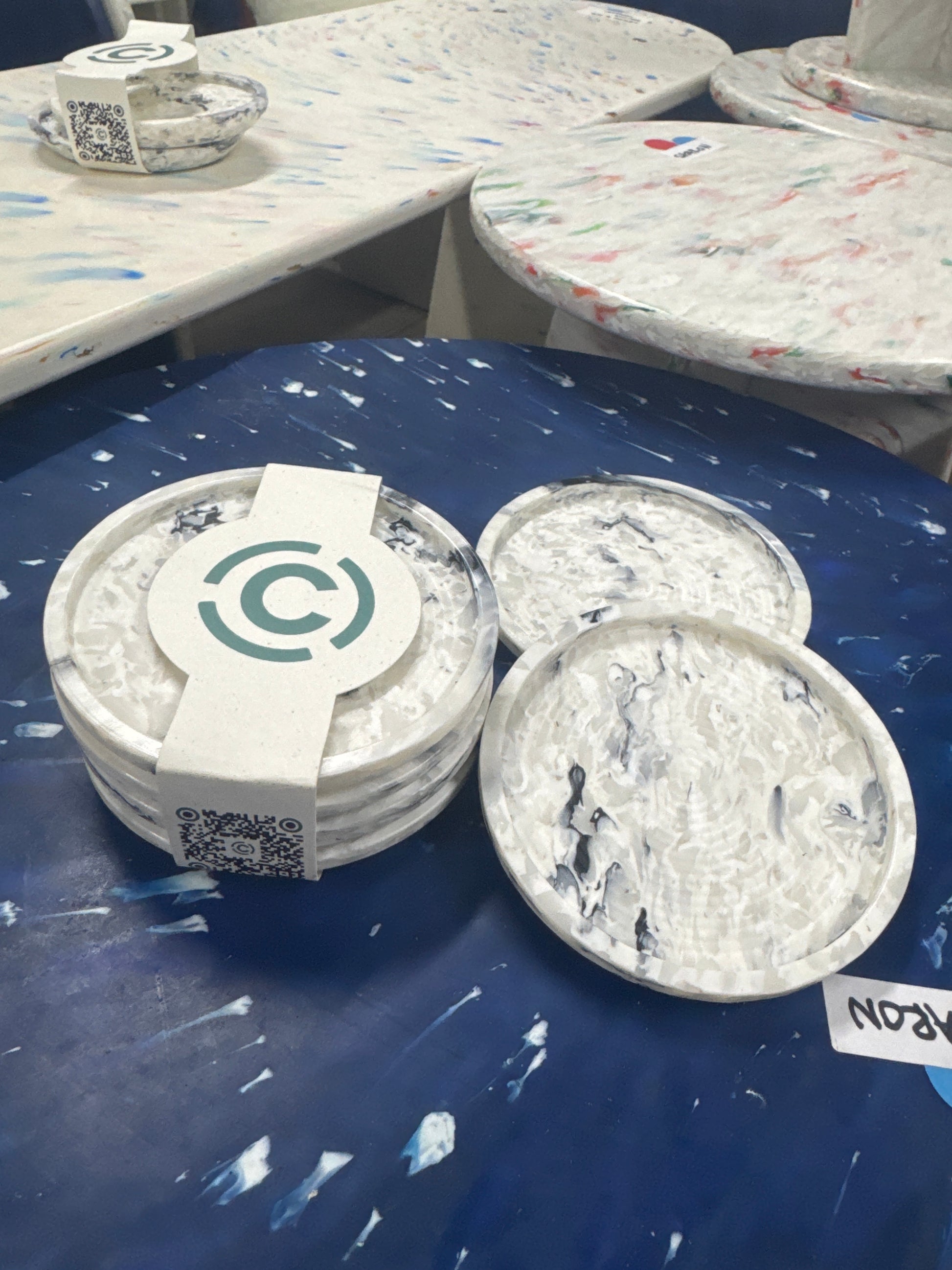 Cada posavasos está hecho con aproximadamente 70 g de plástico HDPE reciclado, el equivalente a 4.7 botellas plásticas, apoyando el reciclaje local y reduciendo el impacto ambiental.